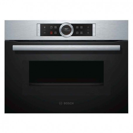 فر مایکروویو توکار بوش مدل CMG633BS1I سری ۸ جز دسته محصولات توکار شرکت بوش محسوب می شود این فر مایکروویو پنل استیل و دربی از جنس شیشه مشکی دارای ظاهری بسیار مدرن می باشد این مدل که در کشور آلمان می شود با گارانتی اصلی بوش سرویس در ایران به فروش می رسد این فر مایکروویو بوش دارای سیستم گرمادهی گریل علاوه بر سیستم ماکروویو نیز می باشد، شما با تهیه این دستگاه در حقیقت یک فر توکار بوش و یک مایکروویو را همزمان در آشپزخانه خود خواهید داشت این مدل دارای یک صفحه نمایشگر لمسی ۲٫۵ اینچی است با سیستم TFT می باشد که در قسمت فوقانی دستگاه قرار دارد این امکان را به شما می دهد تا به برنامه های پخت دسترسی داشته باشید و تنظیمات مورد نظر خود را اعمال کنید کار کردن با آن به قدری آسان است که شما از کار کردن با آن لذت خواهید برد در پنل فر مایکروویو کامپکت توکار بوش مدل CMG633BS1I کامپکت برای سهولت کار ساعت، دما و سایر اطلاعات بر روی صفحه ی دیجیتالی به نمایش گذاشته شده است این دستگاه پس از پایان پخت فرمایکروویو به صورت اتوماتیک خاموش می شود که این ویژگی موجب صرفهجویی در مصرف انرژی نیز می گردد. محفظه ی داخلی این نوع فر از جنس آنتراسیت لعابی است و همچنین دارای یک فن خنک کننده از جنس استیل ضد زنگ نیز است. این فر مایکروویو کامپکت توکار بوش به دلیل کیفیت و کارایی بسیار بالایی که به نسبت قیمت خود دارد یکی از بهترین و پرفروش ترین مدل ها در سری ۸ محسوب می شود.