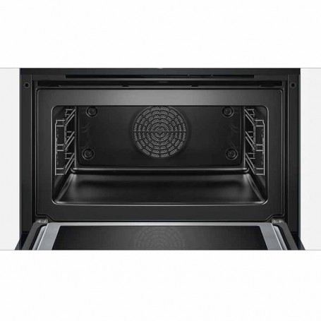 فر مایکروویو کامپکت توکار بوش مدل CMG633BS1I سری ۸ یک محصول متفاوت در انواع فر مایکروویو می باشد شما با استفاده از این فر کامپکت بوش می توانید بسیار سریع و آسان انواع غذاها و کباب ها و شیرینی جات را در منزل تهیه نمایید این مدل دارای گنجایش ۴۵ لیتر است، مایکروویوهای سری ۸ نیز با داشتن توانایی های پخت به روز و پیشرفته این فرصت را به شما می دهند تا هر نوع غذایی را که می خواهید به راحتی و در کمترین زمان ممکن تهیه و سرو نمایید. سیستم مایکروویو موجود در این فر برای گرم کردن و همچنین پخت سریع غذا بسیار کارآمد می باشد یکی از ویژگی های این دستگاه قابلیت پخت ترکیبی است به این ترتیب شما می توانید با تنظیم نوع پخت ترکیبی متناسب با غذای خود آن را در دستگاه گذاشته و غذایی آماده و لذید دریافت کنید، فر مایکروویو کامپکت توکار بوش مدل CMG633BS1I دارای پنج حالت گرمادهی مختلف می باشد که در ابتدای متن به آن اشاره کردیم. حداکثر دمای این نوع فر مایکروویو بوش ۲۷۵ درجه ی سانتیگراد است. سیستم قفل کودک در زمان کار با دستگاه نیز امکانی دیگر از این دستگاه می باشد در این فر مایکروویو بوش توکار کامپکت سیستم Cook Control یا کنترل گرمایش غذا وجود دارد با دامنه ی گرمایی ۳۰ تا ۲۷۵ درجه ی سانتی گراد. فر ماکروویو بوش دارای ۱۴ برنامه خودکار است.